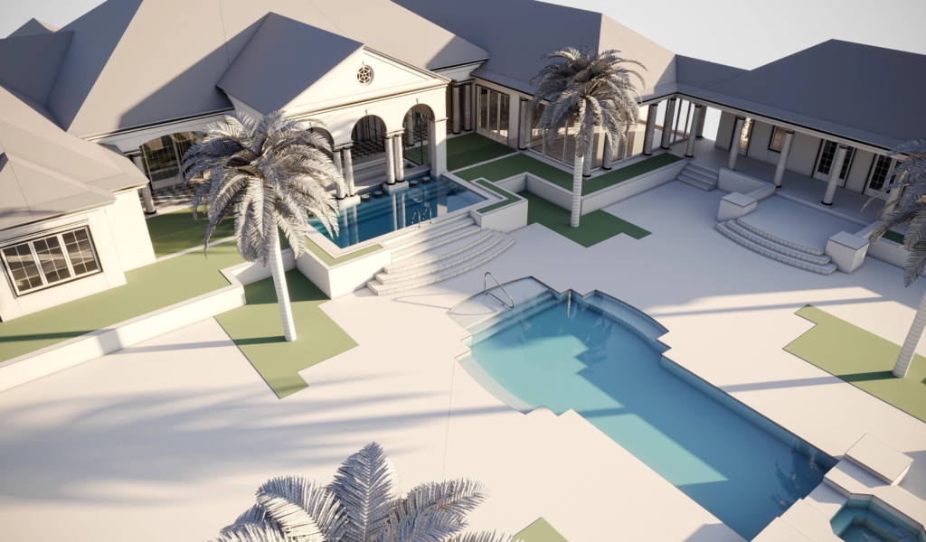 The second step in creating CGI exterior renderings is producing clay renders, which focus purely on the geometry of the 3D model without any textures or colors applied. This allows the client to examine the building’s form, layout and how it fits within its surroundings. It is a critical step for identifying any proportional issues or mistakes before proceeding to the final image.