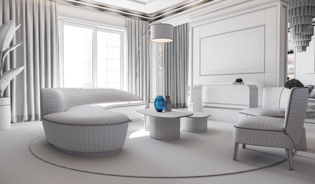 In the CGI world, 3D modeling of an interior space is considered the first step in creating the interior visualization. It involves creating a digital representation of the interior environment, encompassing elements such as furniture, walls, floors, and decor, ranging from simple to complex geometry.