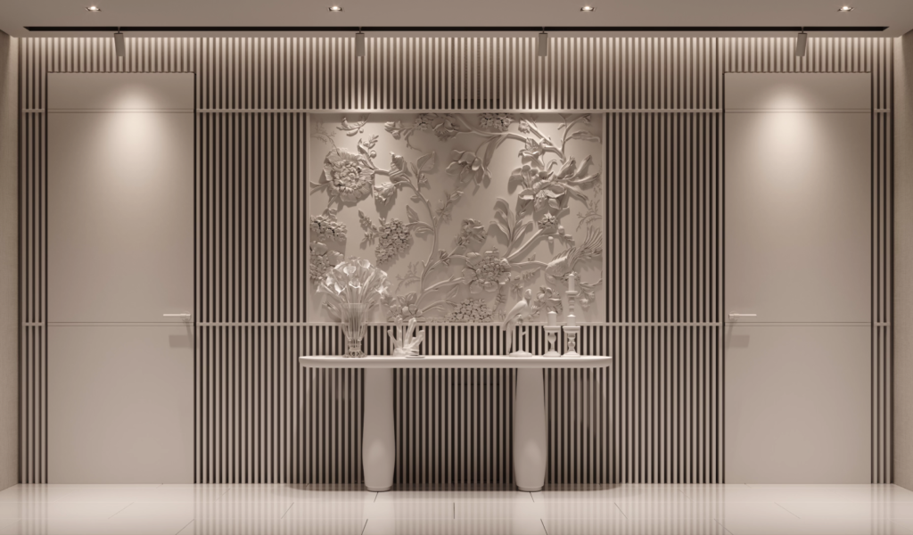 The next step in the visualization process involves creating clay renders, which are simplified, monochromatic representations of the 3D model without textures or colors. These renders focus on the form and lighting, providing a clear view of the spatial layout and architectural elements. They help in assessing the overall composition, proportions, and lighting effects.